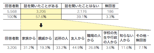 こうしたイメージは、日常生活の中で差別的な発言や行為となって姿をあらわします。表1は、「同和地区の人はこわい」という話を聞いたことがあるかどうか、そして聞いたことがある場合は、それは誰から聞いたのかをたずねた質問の結果です。なんと府民の過半数の人が、こんな会話に接しているのです。しかもそれは、「友人」「近所」「家族」「職場」など、およそ日常生活のあらゆる場で繰り広げられていることがわかります。部落差別の現実は、府民の生活の中にこんな形でも姿をあらわしています。
